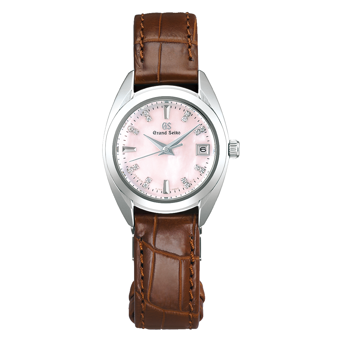 ピンクの白蝶貝ダイヤルと、ベーシックなブラウンのクロコダイルレザーバンドを組み合わせ、落ち着きと女性らしさを兼ね備えたモデルです。