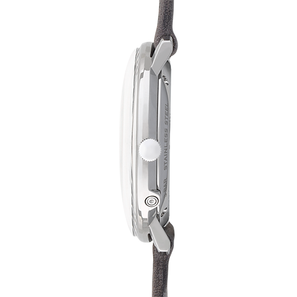 ケース素材には、軽量で肌に優しいチタニウムを採用。わずか30g(ストラップ含む)という驚異的な軽さは、着けていることを忘れるほどの快適な装着感を提供します。マットな質感のグレー・カーフレザーが、現代的な知性を演出します。