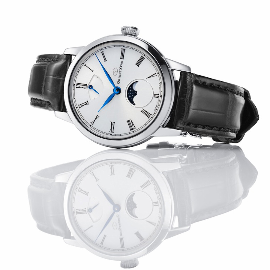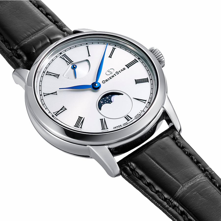ホワイト文字板のレギュラーモデルが描き出すのは「夜の静寂に月がひとつ」ある情景。きめ細かな放射目仕上げに厚クリア塗装(ラッピング加工)を加えた文字板は、艶やかで優美な質感にブルーのリーフ針が映え、上質なクラシシズムを演出。