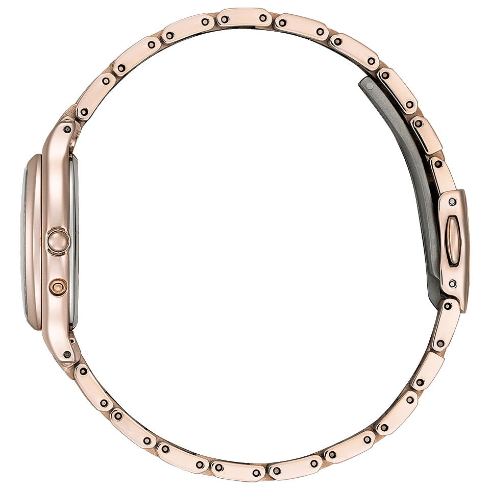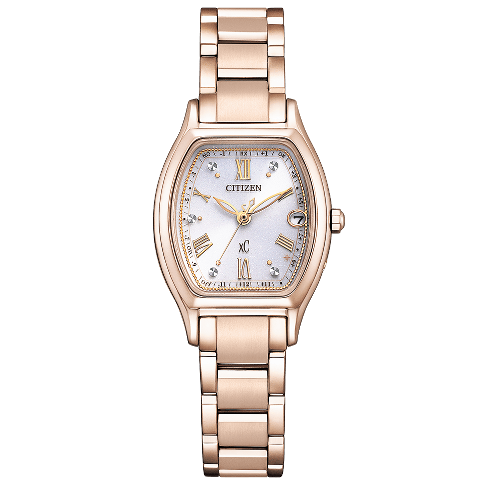 光を感じさせる柔らかいホワイトダイヤルに、煌めくパール調のデザインが手元を動かすたびに美しく輝きます。優美な印象のローマフォントもポイントです。4時と5時の間にあるTYO位置には煌めく光のマークが女性心をくすぐります。シチズンだけのサクラピンクが上品で美しい印象を引き立てます。