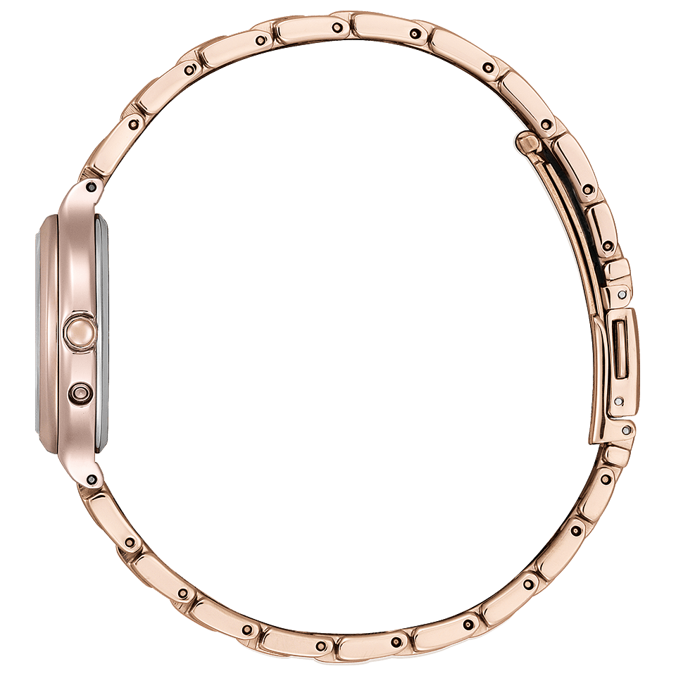 丸みを帯びた人気の小ぶりなトノー型ケース。インデックスには、オリジナルのアラビアフォントを採用。女性らしさと見やすさを兼ね備えています。都市表記のTYOの位置には、ハートをワンポイントとしてあしらいました。バンドは長さ調整が手軽なシンプルアジャストバンド。