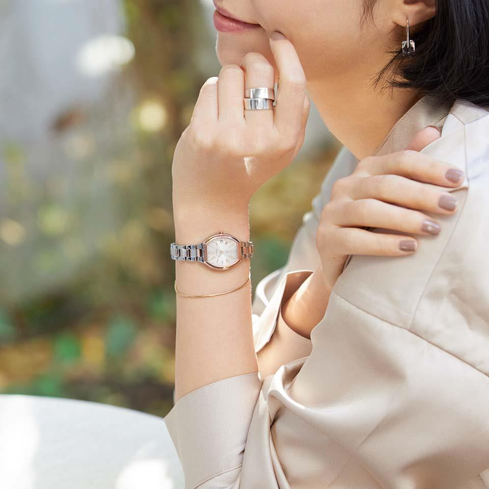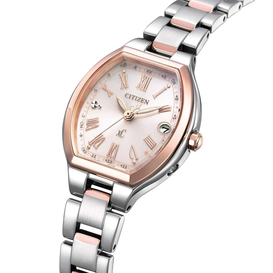 愛らしい印象の淡いピンクカラーに優美な印象のローマフォントがポイントのダイヤル。4時と5時の間にあるTYO位置には煌めく光のマークが女性心をくすぐります。ケース・バンドにはxCならではのピンクゴールドカラーをさりげなくあしらうツートン仕様で、上品な華やかさを演出してくれます。