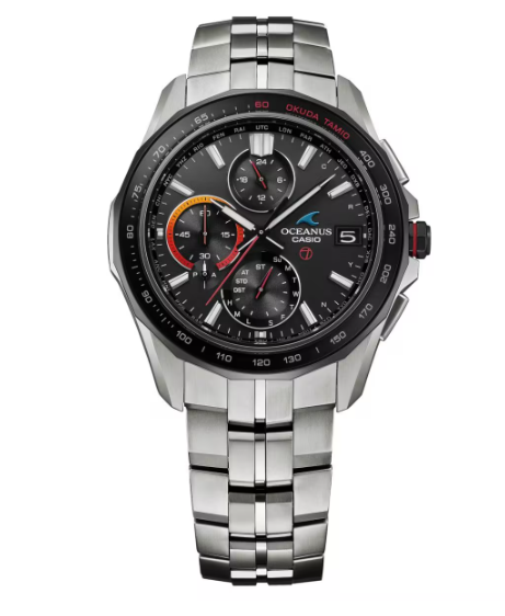 サファイアガラスベゼルのタキメーターには「OKUDA TAMIO」の文字と生誕60周年を祝い「60」の文字を赤色にした特別仕様。9時側のインダイアルリングは、自身の好きな色であるオレンジと赤のグラデーションデザインを採用しています。