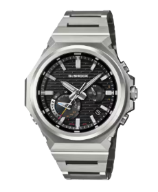 ロゴを排したベゼルは光の角度で表情を変え豊かな質感を演出。ステンレススチール製のバンドにはヘアライン仕上げとミラー仕上げを施し、三つ折れ式中留は端正なデザインとホールドが魅力です。