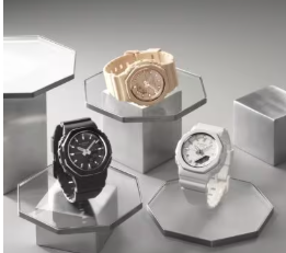 人気のアナログ・デジタルコンビネーションシリーズからベゼルの内側と外側からのぞくメタリックリングが印象的なモデルが仲間入り。GMA-P2100シリーズと同等のサイズ・装着感でありながら、メタリックパーツのさりげない輝きが高級感や洗練さを演出しています。