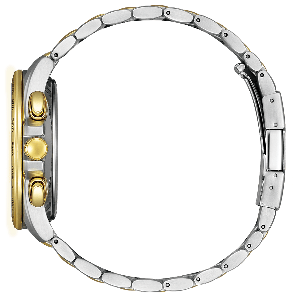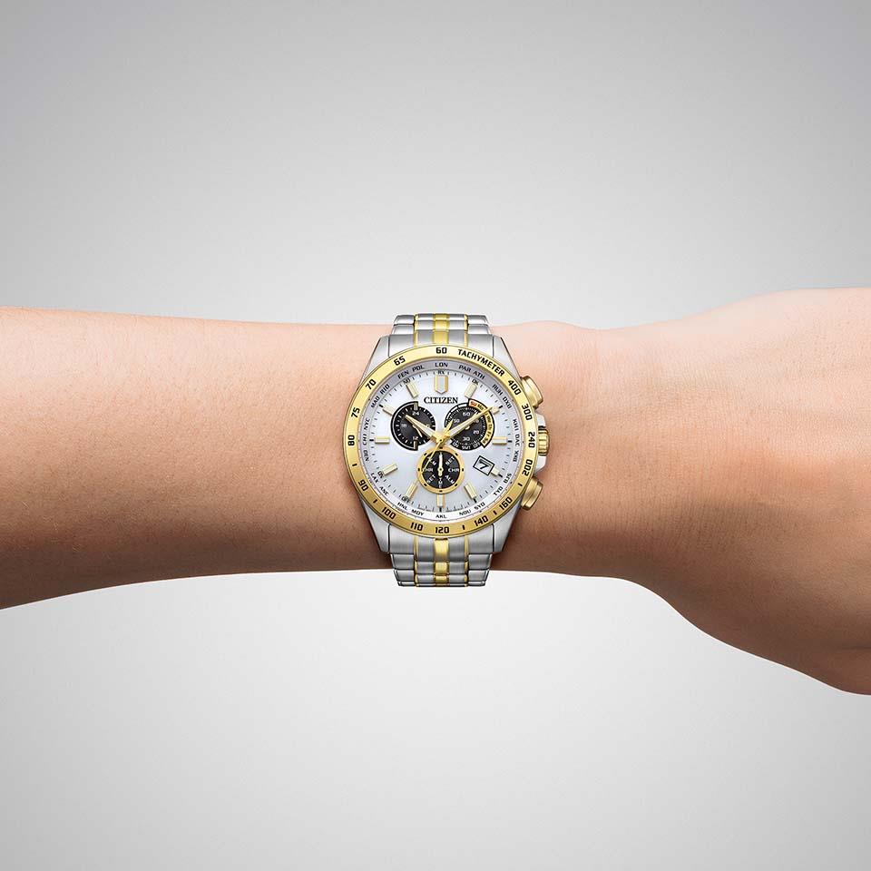 やや大きめの43mmケースに、視認性を確保した夜光付きの太めの針とインデックスを採用したエコ・ドライブ電波時計。バンドの中駒には、ミラー仕上げのゴールドラインをアクセントとしてプラス。文字板、針、りゅうずにもゴールドのパーツを使用した、腕元に華やかさを添える1本です。