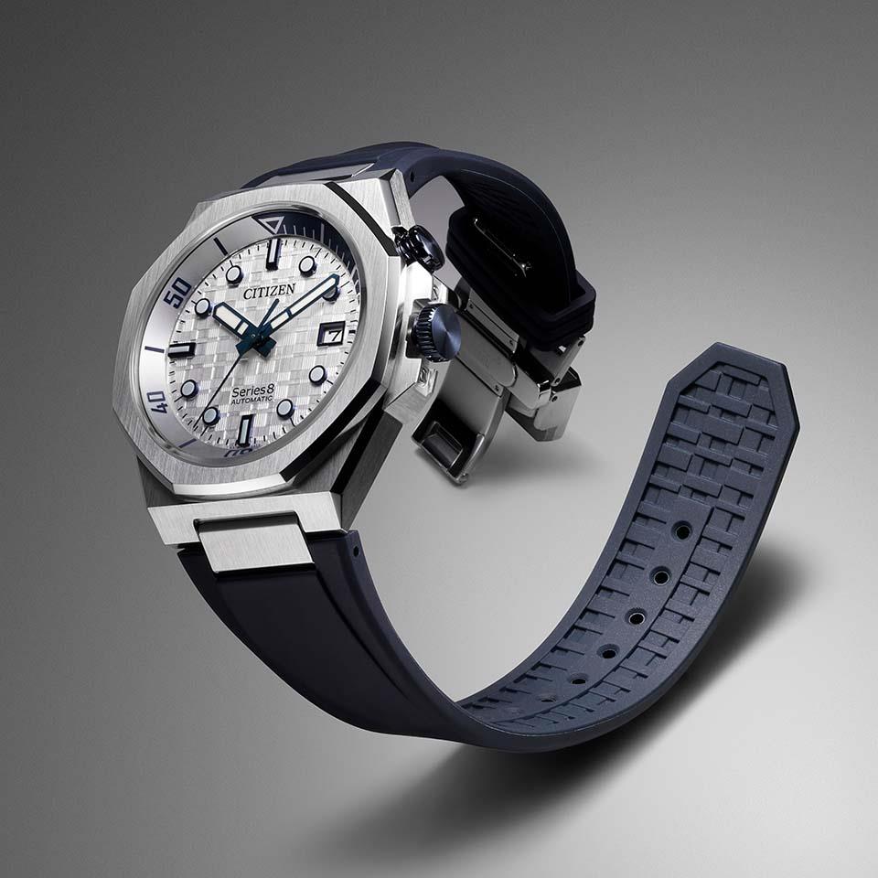 センターケース両サイドにガードパーツを組み合わせ、全体を5体構造で仕上げたエッジ感の強いケースデザインを採用。ヘアラインとミラーの複雑な磨き分けを施し、美しい質感を実現しました。2時位置にはインナーベゼル操作用のりゅうずを配置。回しやすさを考慮したサイズに設定しています。裏ぶたはムーブメントの鼓動を感じられるシースルーバック仕様。磁気による時刻のズレを防ぐシリーズエイトの基本性能「2種耐磁」も備えています。