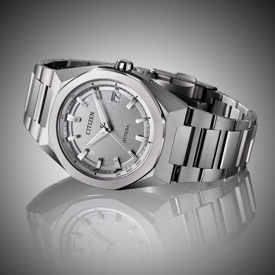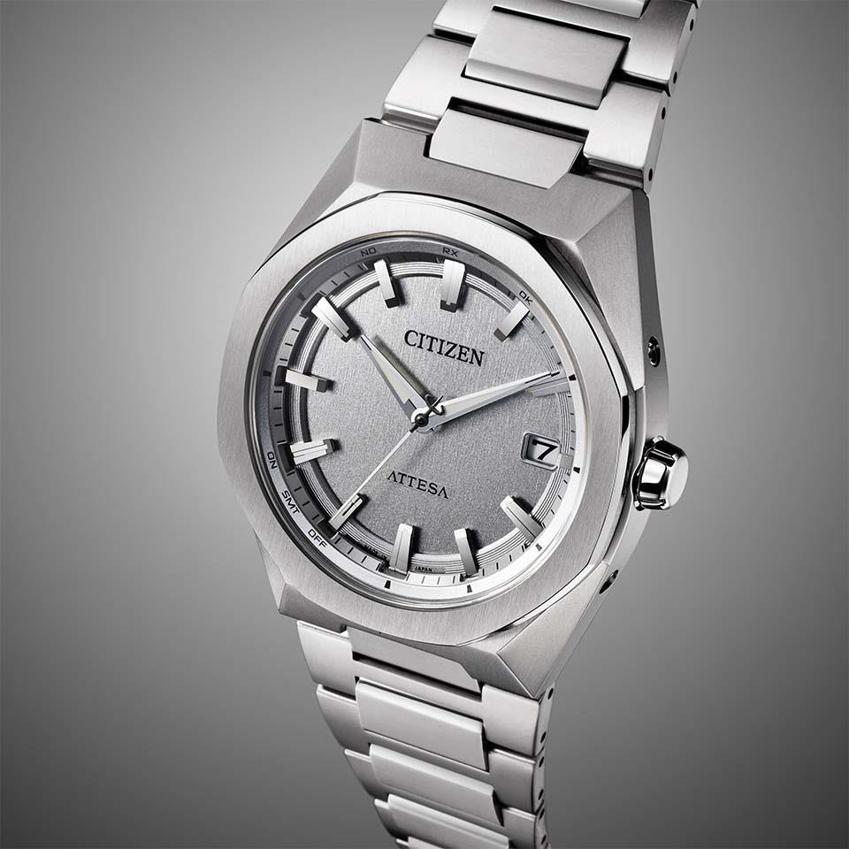 シルバーのワントーンでまとめた清潔感あふれるすっきりとしたルックスで、メタリックな質感を追求した文字板と美しく調和しています。