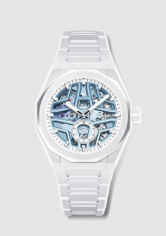 100本限定の「デファイ スカイライン スケルトン ホワイト サーファー」は、Time + Tideとのコラボレーション第3弾にして最後となる「サーファー トリロジー」モデルです。ホワイトのセラミックケースと一体型ブレスレットを組み合わせ、グラデーションブルーのオープンワーク文字盤とスケルトンムーブメント エル・プリメロ 3620 SKをブルートーンで合わせています。ゼニススターの形をした文字盤のブリッジはスーパールミノバで構成され、夜間におけるビジュアルのインパクトを高めています。オリジナルの「デファイ クラシック スケルトン ナイトサーファー」と共に、発光のスターロゴを採用した数少ないゼニス ウォッチです。
