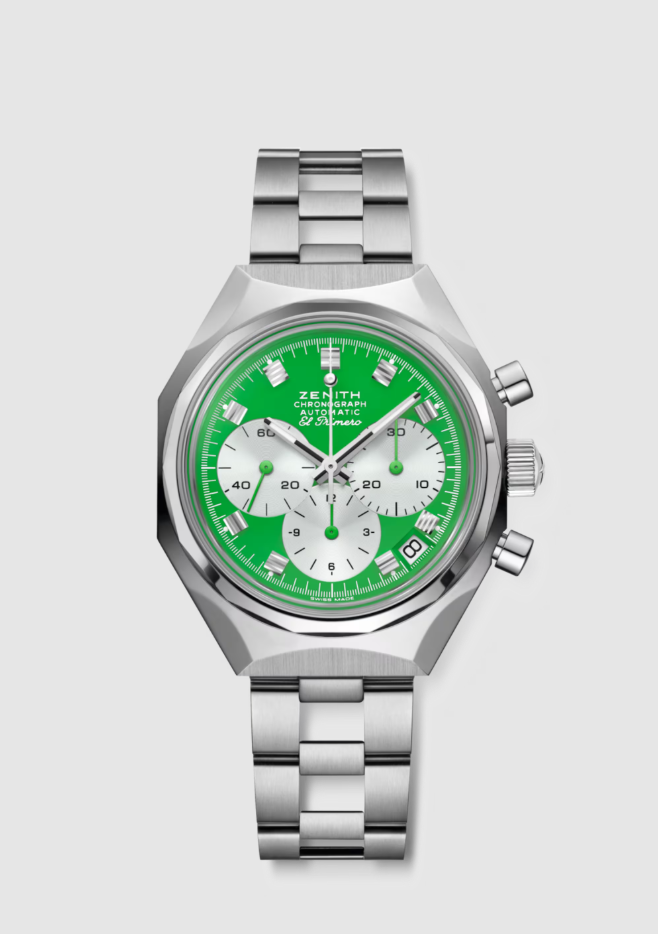 初代デファイの腕時計からインスピレーションを得て、“架空の遺産”を形にした作品には、ゼニスが1969年に発表した世界初の高振動自動巻クロノグラフの系譜に連なる伝説的なエル・プリメロ 400 クロノグラフが搭載されています。また、1960年代を象徴するもうひとつのデザイン、USMハラーシステムに敬意を表しています。14面のベゼルを備えた八角形のステンレススチールケースに、USM グリーンの文字盤を組み合わせています。象徴的なゲイフレアー社の「ラダー」ブレスレットが付属。