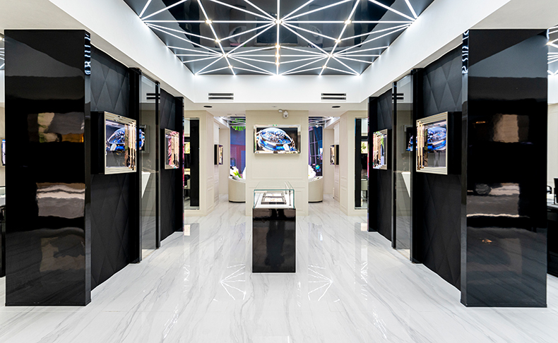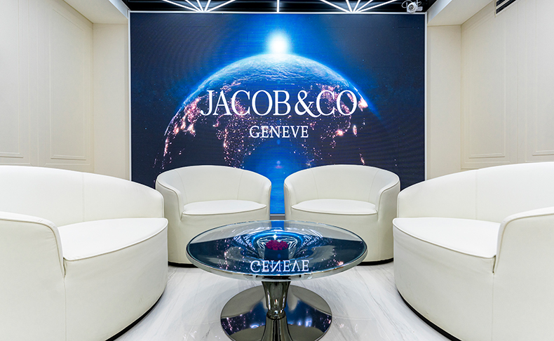 店内は白と黒を基調にした洗練空間に、ニューヨーク本店と共鳴する幾何学的LEDデザインや大型モニターを備え、ブランドの世界観を体感できます。JACOB&CO.は、独創的なデザインと最高峰の技術を融合させた超高級機械式時計を展開し、世界中のセレブリティを魅了し続けています。