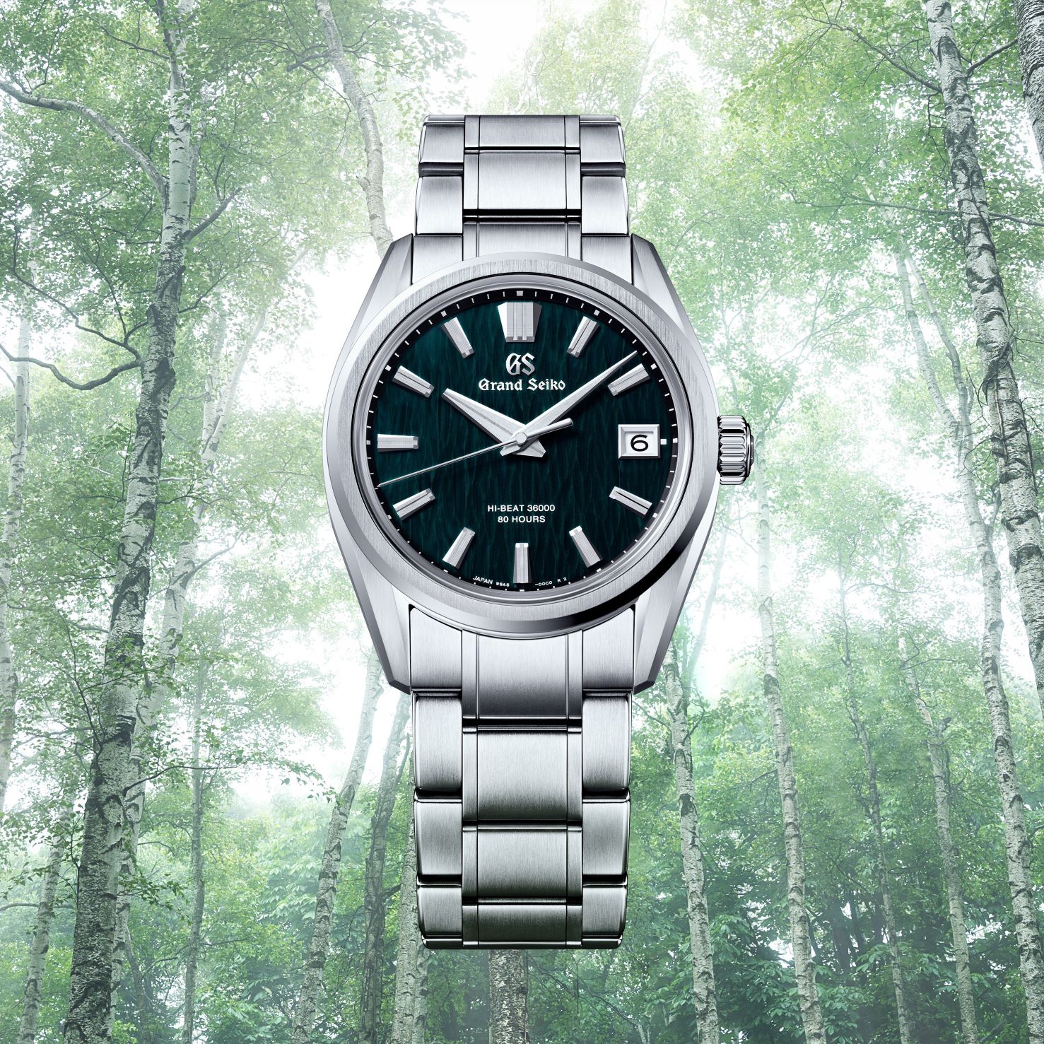 グランドセイコーの機械式時計の製造拠点「グランドセイコースタジオ 雫石」の近くには、日本有数の白樺の群生地域があります。高原の澄んだ空気をまとい、すらりと高く伸びた白樺が奥行きを持って幾重にも林立する神秘的な光景からは、自然の美しさや力強さを感じることができます。本作では、この壮麗な白樺林をダイナミックな型打模様と繊細なカラーリングを施したグリーンダイヤルで表現しています。