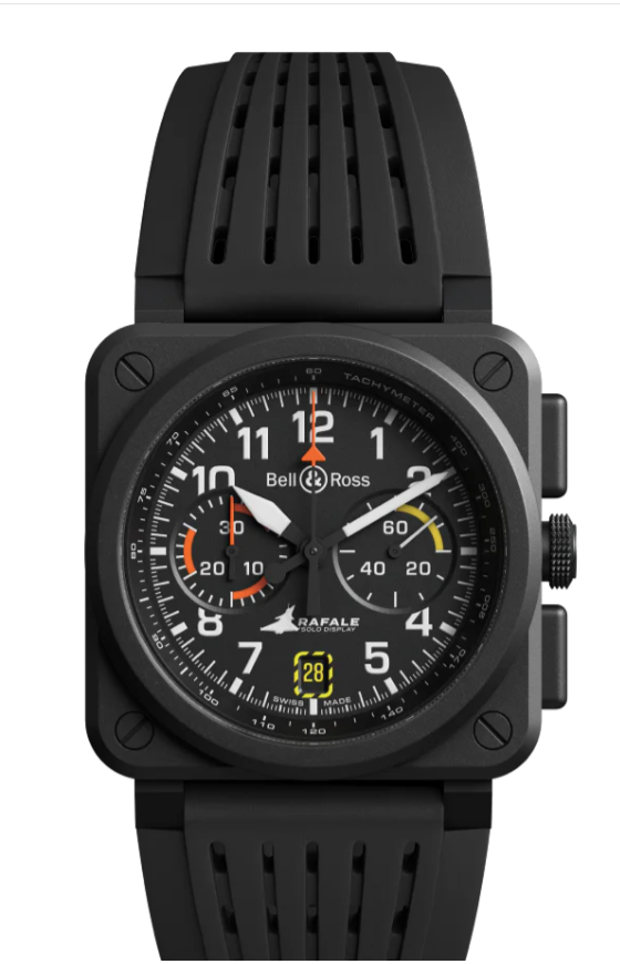 「ラファール・ソロ・ディスプレイ」の極限的な条件に合わせて設計された BR-03 は、堅牢性、精度、即時の読み取りやすさを兼ね備えたクロノグラフです。文字盤にはラファール戦闘機のシルエットと、日付表示窓の黄色い点線やオレンジ色のクロノグラフ針などといったコックピットから着想を得たグラフィック要素が採用されています。フォトルミネセンス(蓄光)のインデックスとカウンターにより、暗所でも最適な読み取りが可能です。Rafale Solo Display のロゴが入ったこの時計は、500 本の限定シリーズで製造されています。