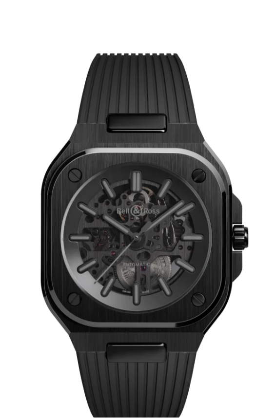 500本限定のBR-05 スケルトン ファントム セラミックは、卓越した技術とデザインを融合させたモデルです。ブラックセラミック製のケースとブレスレットからは、スケルトンムーブメントが透けて見えます。