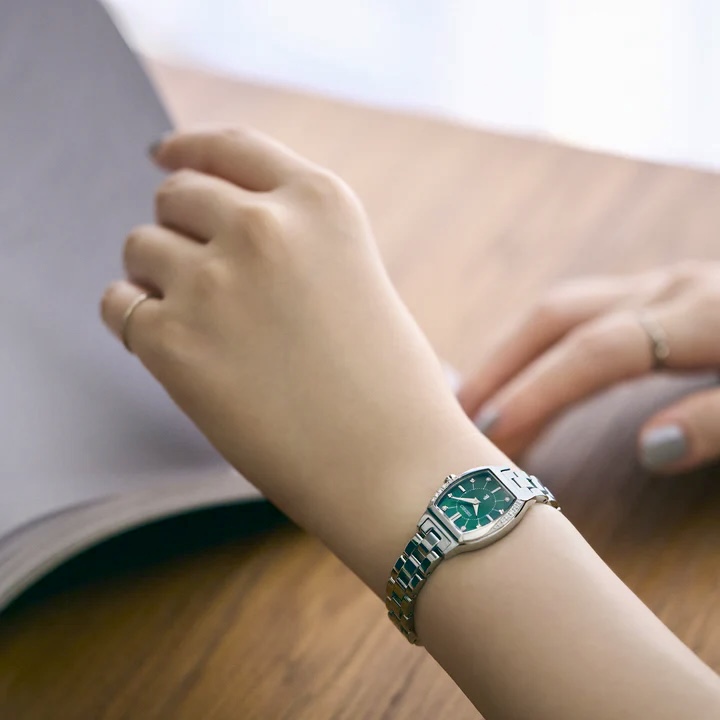 美しいモミの木のような深いグリーンの白蝶貝ダイヤルに、木々に降り積もる雪の煌めきを、4箇所のラボグロウン・ダイヤモンドと輝くインデックスで繊細に表現しました。