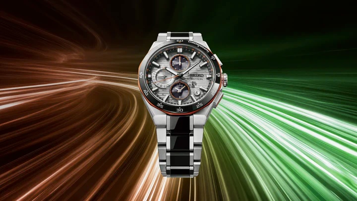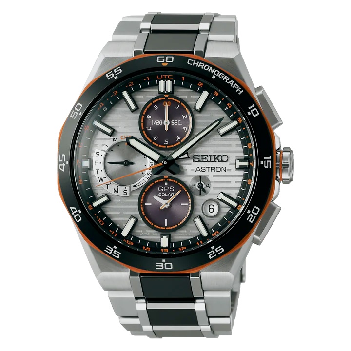 ベゼルとブレスレットの中駒にブラックセラミックスを組み合わせ、随所にネオンオレンジカラーのアクセントを加えた、スポーティなデザインが特徴です。