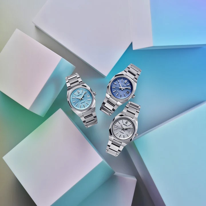 多面カットを施したインデックスと三面カットの時分針、知的な印象を与えるブルーグレーダイヤルには緻密なクリスタルボックスパターンを採用することで、コンパクトサイズならではの高級感のあるデザインを実現。