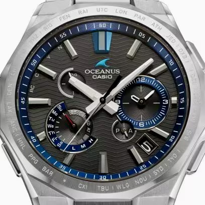 ザラツ研磨によって磨き上げられたケースと12面カットのベゼルでソリッドさを際立たせました。バンドの長さは5mm間隔で調整可能。ダイアルにはOCEANUSが着想の源にしている海の波をパターンに採用しています。