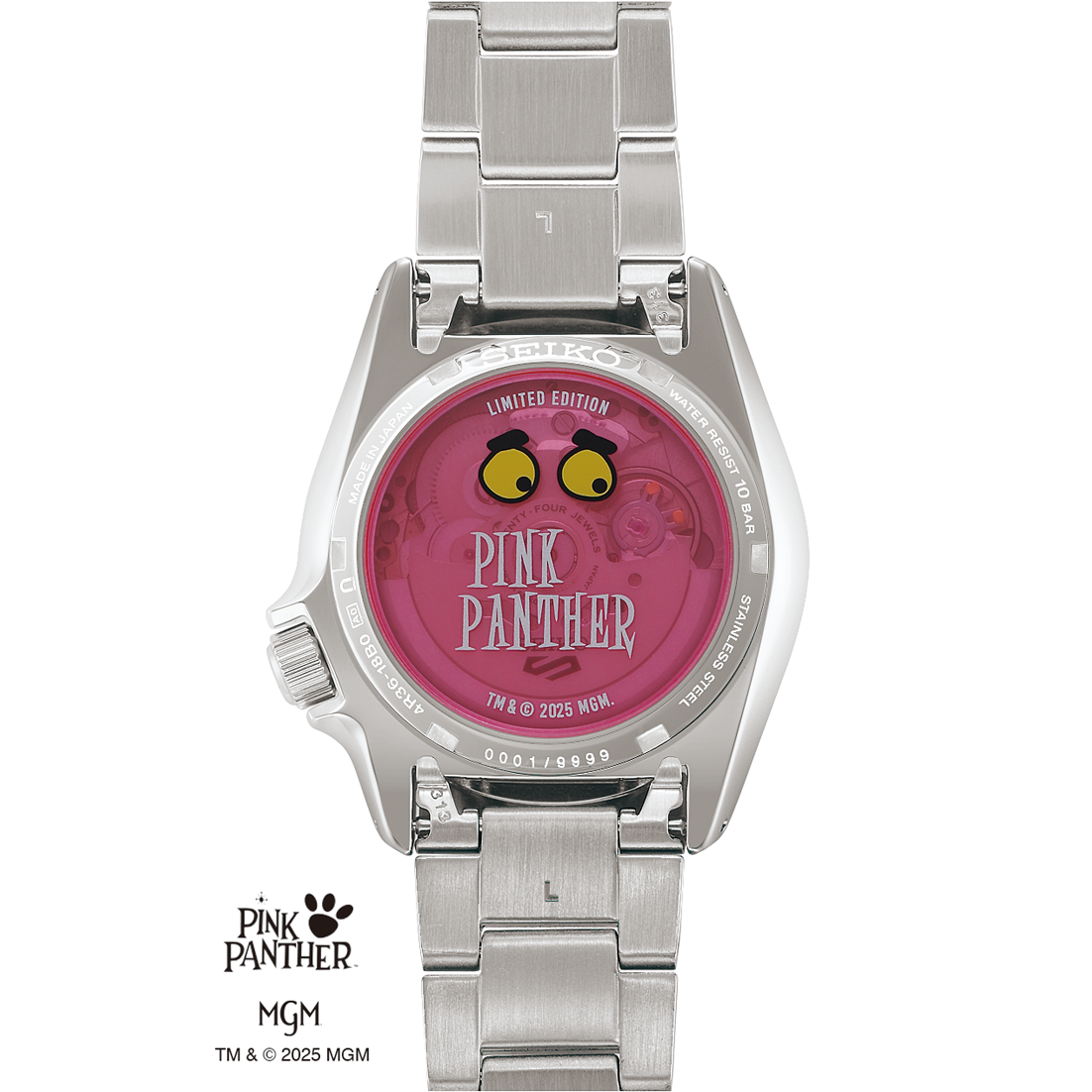 ピンクパンサーは、1964年公開の映画『ピンクの豹』のオープニングで誕生して以来、世界中から愛される人気キャラクターです。クールでありながら、好奇心旺盛でいたずら好き。そんな個性豊かなキャラクターは世代を超えて人々に笑顔を届けてきました。今回のモデルは、そのピンクパンサーの遊び心と大胆さを重ね合わせ、日常を彩り、身に着ける人にワクワクと楽しさを届ける一本として生まれました。本作は<セイコー 5スポーツ>SKXシリーズをベースに、短編アニメ「The Pink Phink(ピンク騒動)」の世界を表現したモデルです。ピンクパンサーがいたずらでリトル・マンの家をピンクに塗り替えるストーリーを腕時計全体に落とし込み、ダイヤルやベゼル、秒針にシグネチャーカラーのピンクを採用。さらに、リトル・マンがピンクパンサーを見つけるきっかけとなった足跡をダイヤルにあしらい、遊び心あふれる一本に仕上げました。付け替え可能なナイロンストラップが付属し、ダイヤルと同様にピンクパンサーの足跡をデザインしています。さらに先端には、アニメーションに登場した「WET PAINT(ペンキ塗りたて)」の文字をプリント。このフォントはベゼルの数字にも使われており、第一話の魅力を細部にまで表現した仕上がりとなっています。