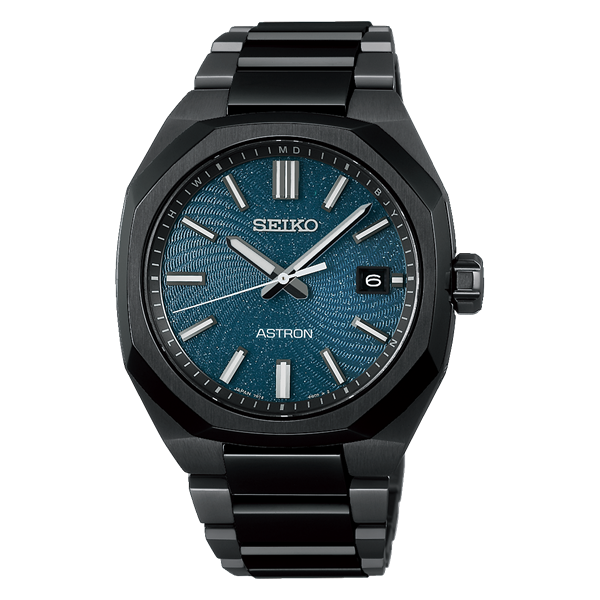 Nexter “Starry Sky” 2026 限定モデル.。星々が渦を巻く、壮大で神秘的な銀河をモチーフにしたデザイン。ダイヤルには新たに開発した「スパイラルパターン」の型打ち模様を施しています。ダイヤルの中心から広がる螺旋状の模様は、流れる星々のエネルギーを伝えます。また、漆黒な宇宙の中で、渦巻く銀河が浮かび上がる様を、オールブラックカラーのケース・ブレスレットと、ダークターコイズカラーをベースとしたラメ入りダイヤルが表現しています。ケースとブレスレットには、軽量でさびにくいチタン素材を採用することで軽快な装着感を実現するとともに、表面には傷がつきにくいブラック硬質コーティングを施しています。また、ブレスレットの中央の駒は鏡面仕上げで、銀河の輝きと連動した艶のあるデザインとなっています。ブレスレットの中留には、ブレスレットの長さを簡単に微調整できる「スマートアジャスター機構」を採用しています。