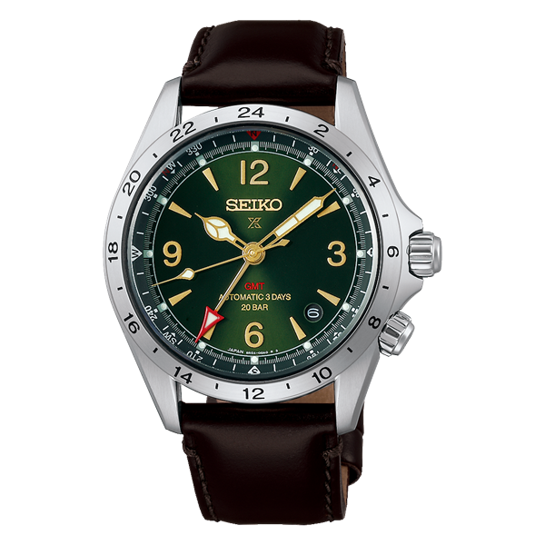 味わい深い魅力を放つ、品格のある装備品。1959年に誕生したセイコー初のスポーツウオッチ「ローレル アルピニスト」をルーツに持つ、山から街へ、世界中で愛され続けるタイムピース。3日間(約72時間)のロングパワーリザーブとGMT機能を有した6R54を搭載。内転リングに簡易方位計を装備し、アウトドアシーンからタウンユースまで幅広く活躍するモデル。深みのあるグリーンのダイヤルとブラウンのレザーストラップがドレススタイルにもマッチ。