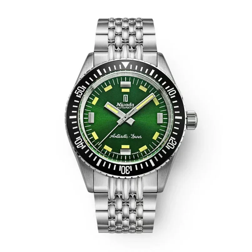 12時位置には伝説的な「Nivada Automatic」ロゴ、6時位置には味わい深いヴィンテージ書体による“Antarctic Diver”の表記を配し、往年の意匠を印象的に再現しています。さらにケースバックには、南極コレクションの象徴でもあるペンギンの横顔がエングレーヴィングされ、モデル名の世界観をさりげなく物語ります。