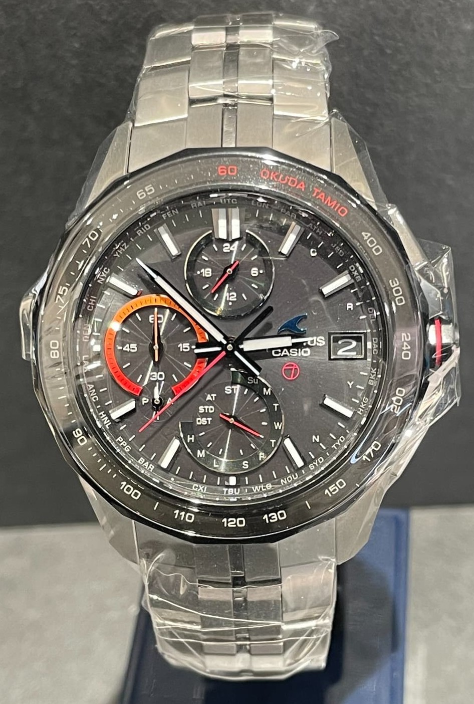 サファイアガラスベゼルのタキメーターには「OKUDA TAMIO」の文字と生誕60周年を祝い「60」の文字を赤色にした特別仕様。9時側のインダイアルリングは、自身の好きな色であるオレンジと赤のグラデーションデザインを採用しています。