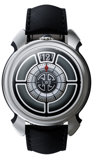 特徴:ケース12時位置にリュウズを配置。文字盤12時位置にディスク式の時表示、中央に分表示ダイヤルと、その内側にロゴを刻み込んだ円形のスモールセコンド
