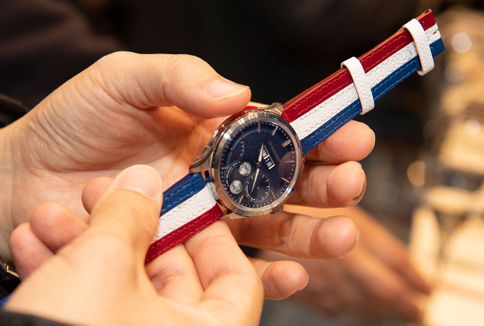 ここには表面を研磨して独特の粒模様を際立たせたピンクのガルーシャ・ストラップ装着モデルをはじめ、フランスの三色国旗をイメージしたトリコロールのモデルやフィッシュ(サーモン)スキンを用いたものなど、実にバラエティ豊かなストラップを装着したモデルがずらりと並び、来場者を楽しませた。