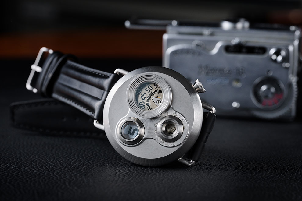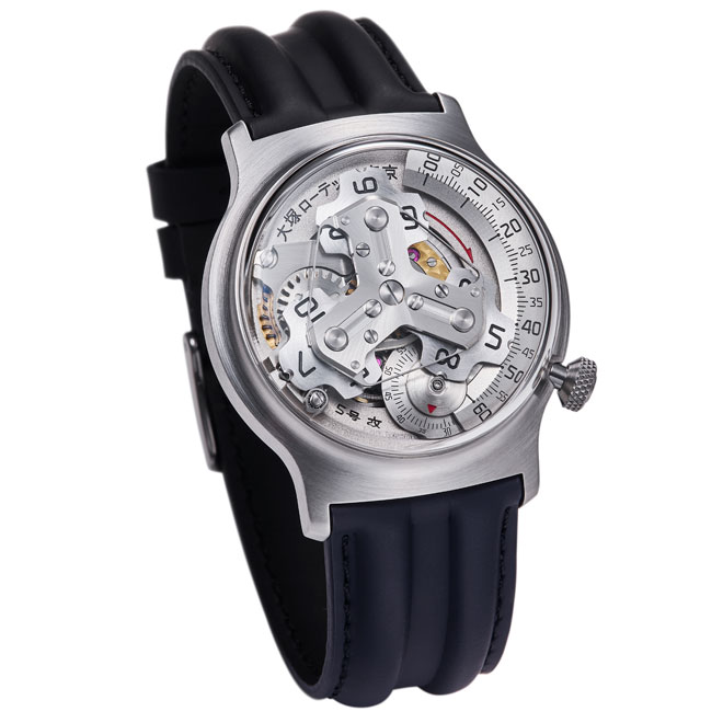 大塚ローテック創業の2012年に発売された「5号」のデザイン要素を継承する2025年発表の「5号改」。「5号」はレギュレーター機構だが、当モデルは回転する3個のサテライト(衛星)アワーディスクと、固定された扇型のミニッツスケール(3時側)との組み合わせで時刻を読み取る機能が最大の特徴である。