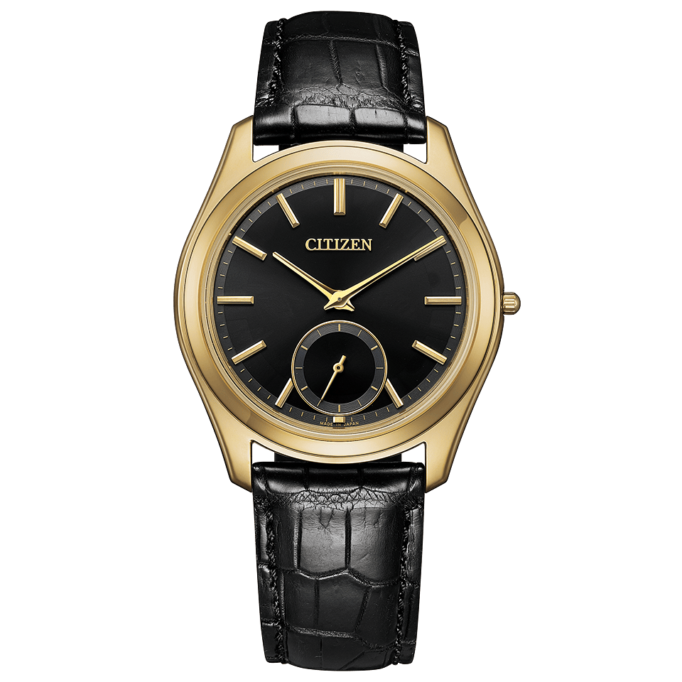 AQ5022-02E キャリバーNo:8845 動力:光発電エコ・ドライブ 精度:±15秒/月 持続時間:光発電約7ヶ月 重量:42g 厚み:4.5mm ケースサイズ:横 36.6mm ケース素材:ステンレス ケース表面処理:デュラテクトアンバーイエロー(アンバーイエロー色) バンド素材・タイプ:ワニ革、三ツ折れプッシュタイプ バンド幅:19.0mm バンド調整可能サイズ:144~194mm ガラス:サファイアガラス(クラリティ・コーティング) 防水性能:日常生活用防水 機能: 充電警告機能 充電禁止温度検出機能 過充電防止機能 クイックスタート機能 フル充電時約7ヶ月可動 原産国:日本製 じっくりとただ静かに、自分だけの時間を愉しむ大人たちへ。 わずか1.00mmのムーブメントがもたらす、何物にも代えがたい心地よさをその腕に。 シチズン独自の表面硬化技術デュラテクトの新色、落ち着いたイエローゴールド色「アンバーイエロー」のケースに艶やかなブラックの文字板。無駄を削ぎ落した薄型フォルムとの調和を追求し、6時位置に配したスモールセコンドはインデックスを短くするなど、ミニマルな要素でまとめています。 AQ5022-02E オンラインショッピングページ