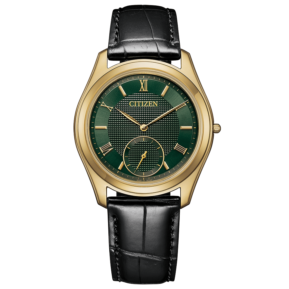 AQ5022-02W 特定店限定モデル 世界限定160本 キャリバーNo:8845 動力:光発電エコ・ドライブ 精度:±15秒/月 持続時間:光発電約7ヶ月 重量:42g 厚み:4.5mm ケースサイズ:横 36.6mm ケース素材:ステンレス ケース表面処理:デュラテクトアンバーイエロー(アンバーイエロー色) バンド素材・タイプ:ワニ革、三ツ折れプッシュタイプ バンド幅:19.0mm バンド調整可能サイズ:144~194mm ガラス:サファイアガラス(クラリティ・コーティング) 防水性能:日常生活用防水 デザイン特徴:裏ぶたリミテッドエディションナンバー入 機能: 充電警告機能 充電禁止温度検出機能 過充電防止機能 クイックスタート機能 フル充電時約7ヶ月可動 原産国:日本製 じっくりとただ静かに、自分だけの時間を愉しむ大人たちへ。 わずか1.00mmのムーブメントがもたらす、何物にも代えがたい心地よさをその腕に。 シチズン独自の表面硬化技術デュラテクトの新色、落ち着いたイエローゴールド色「アンバーイエロー」のケースに、ワインボトルにインスパイアを得たボトルグリーンカラーの文字板はローマ数字とバーインデックスを組み合わせたクラシカルな印象を放つ特別仕様です。 AQ5022-02W 特定店限定モデル 世界限定160本 オンラインショッピングページ