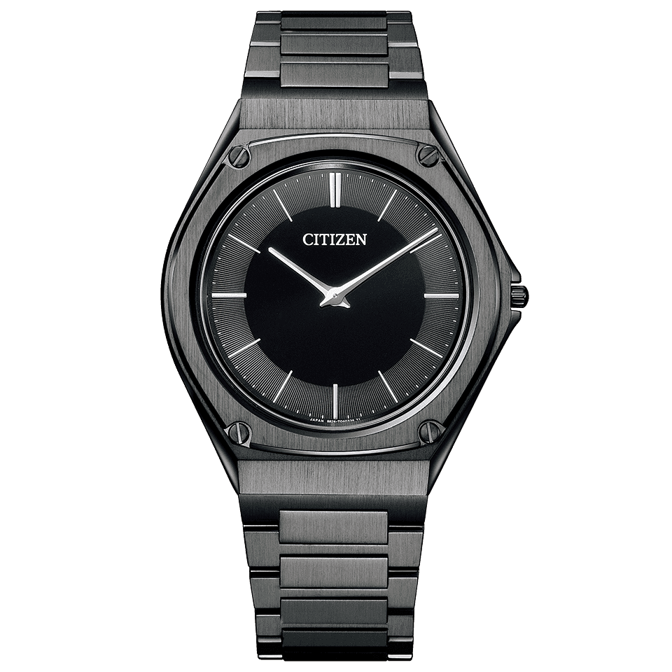 AR5054-51E キャリバーNo:8826 動力:光発電エコ・ドライブ 精度:±15秒/月 持続時間:光発電約1年 重量:70g 厚み:2.98mm ケースサイズ:横 39.0mm ケース素材:ステンレス ケース表面処理:デュラテクトDLC(ブラック色) バンド素材・タイプ:ステンレス、三ツ折れプッシュタイプ バンド幅:19.0mm バンド調整可能サイズ:139~202mm ガラス:サファイアガラス(クラリティ・コーティング) 防水性能:日常生活用防水 デザイン特徴:裏ぶた銘板:シルバー・サーメット 厚み:2.98mm 機能: 充電禁止温度検出機能 過充電防止機能 フル充電時約1年可動 原産国:日本製 じっくりとただ静かに、自分だけの時間を愉しむ大人たちへ。 わずか1.00mmのムーブメントがもたらす、何物にも代えがたい心地よさをその腕に。 シチズン独自の表面硬化技術デュラテクトDLCが実現した艶やかなブラックと、先進素材サーメットが放つピンクゴールドの光沢感。 シチズンの美と強度への追求が生み出した、華やかさと強さを併せ持つモデルです。 シンプルさを追求した先に出来上がったシチズンの持てる技術を詰め込んだ渾身の1本。 最薄モデルをお探しの方には、こちらがお勧めです! AR5054-51E オンラインショッピングページ