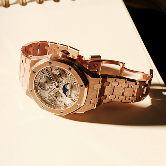 仕様:時・分表示、パーペチュアルカレンダー(曜日、日付、ムーンフェイズ、月、閏年)、グランドタペストリー模様のベージュダイヤル、ベージュのサブダイヤル、蓄光加工が施された18Kピンクゴールドのアワーマーカーとロイヤル オーク針、18Kピンクゴールドのインナーベゼル、反射防止加工サファイアクリスタルとケースバック
