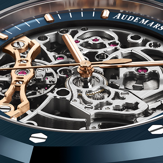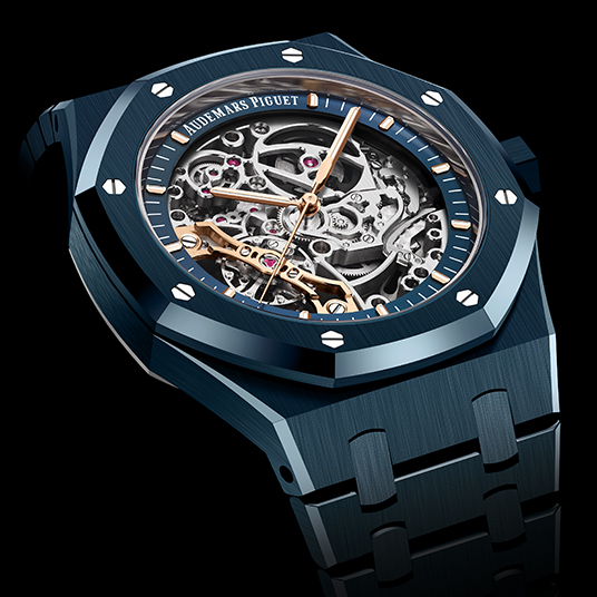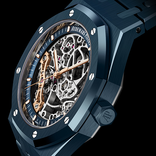 仕様:時・分・秒表示、射防止加工のサファイアクリスタルとケースバック、チタン製ケースバックフレーム、“ナイトブルー、クラウド50”インナーベゼル、18Kピンクゴールド製アワーマーカー、蓄光加工を施したロイヤル オーク針