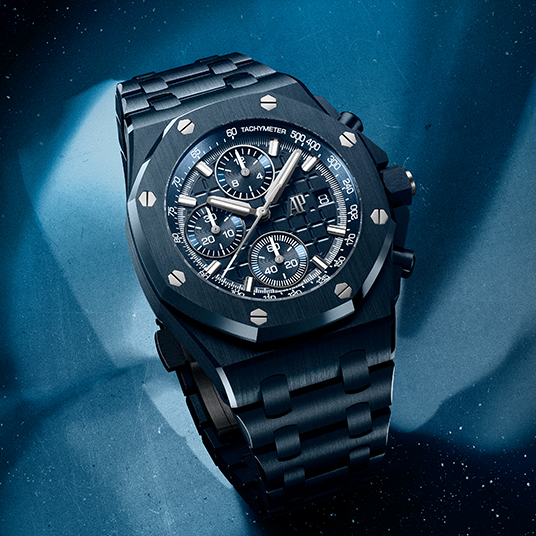 仕様:時・分・秒(スモールセコンド)・日付表示、フライバック クロノグラフ、反射防止加工のサファイアクリスタルとケースバック、チタン製ケースバックフレーム、“ナイトブルー、クラウド50”セラミック製プッシュボタンとプッシュボタンガードとねじ込み式リューズ、チタン製リューズトップ、“ナイトブルー、クラウド50”メガタペストリーダイヤル、“ナイトブルー、クラウド50”カウンター、蓄光加工を施した18Kホワイトゴールド製ロイヤル オーク オフショア針とアワーマーカー、“ナイトブルー、クラウド50”インナーベゼル