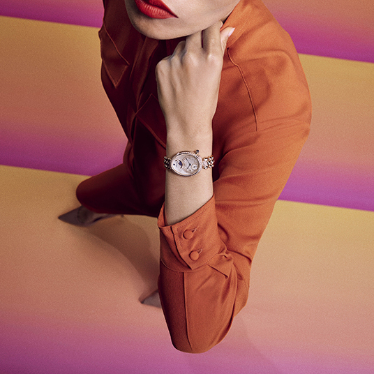 仕様:時・分・秒(スモールセコンド)表示、ムーンフェイズ、ホワイトマザーオブパール文字盤、12時位置にペアシェイプのダイヤモンド、ベゼルとフランジに109個のブリリアントカット・ダイヤモンド、6時位置の丸いセンターラグに52個のブリリアントカット・ダイヤモンドをスノーセッティング、リュウズにブリオレットカット・ダイヤモンド、サファイアクリスタルケースバック