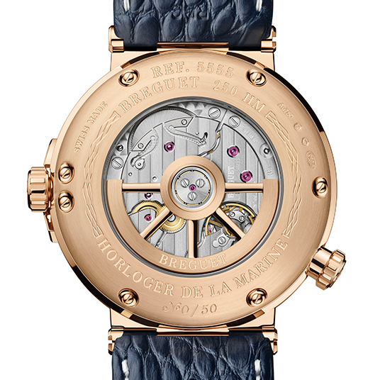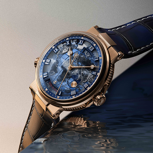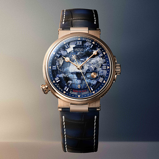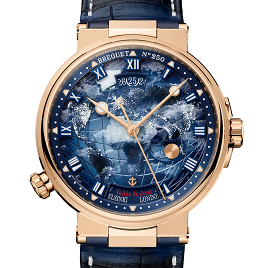 仕様:時・分・秒表示、デュアル・タイムゾーン、ブレゲゴールド色で太陽(ソレイユ仕上げ)と半月(手作業のハンマー仕上げ、ロジウム加工)の各モチーフを配したデイ/ナイト表示、18Kブレゲゴールドとサファイアクリスタルの2層構造文字盤、ギヨシェ彫りによる緯線と経線、ブルーのグラデーション、手描きのエナメル画による大陸のモチーフ、発光エナメル(発光色ブルー)による都市の点、手描きのエナメル画による雲のモチーフ、サファイアクリスタルケースバック、当時ブレゲが使用していたモロッコ革のケースから着想した赤いレザーの250周年スペシャルエディションボックスが付属