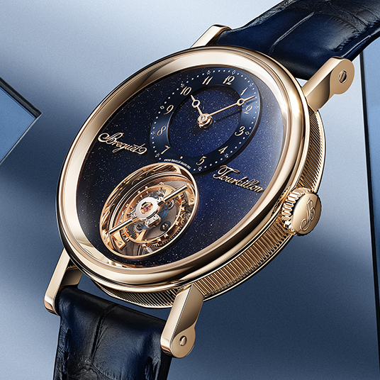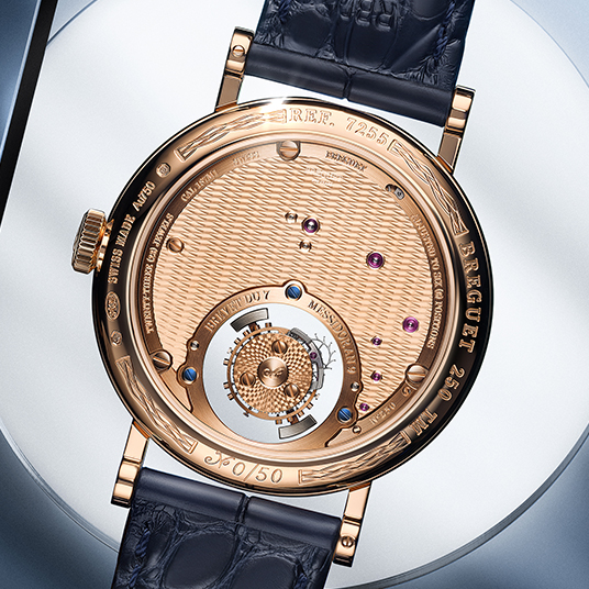 仕様:オフセンターの時・分表示、トゥールビヨンのキャリッジ上にスモールセコンド、グラン・フー エナメル アベンチュリン文字盤、ケースバックのサファイアクリスタルに1/50から50/50の限定シリアルナンバー、ブレゲが使用していたモロッコ革のケースから着想した赤いレザーの250周年スペシャルエディションボックスが付属