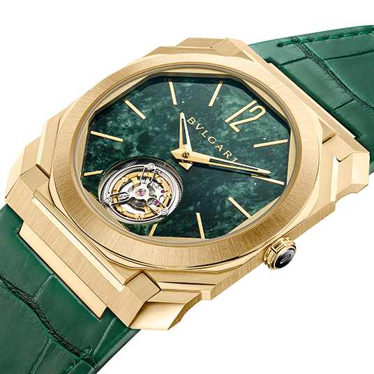 仕様:時・分表示、フライングトゥールビヨン、ブラックセラミックをあしらったポリッシュ加工イエローゴールド製リューズ、グリーンヴェルデアルピ大理石ダイアル、シースルーケースバック