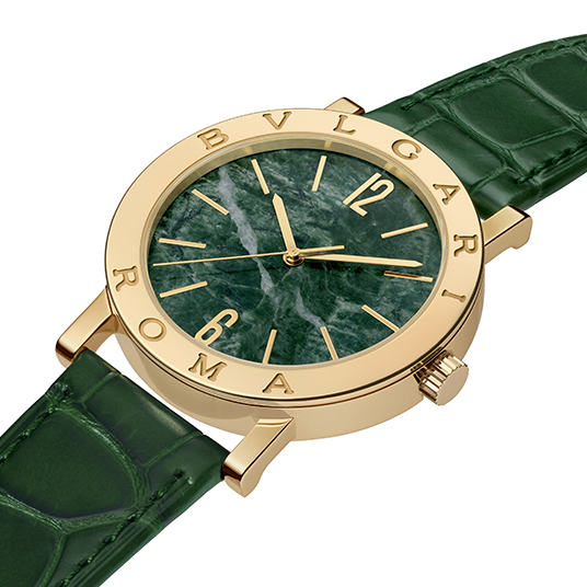 仕様:時・分・秒表示、BVLGARI ROMAのロゴが刻印されたイエローゴールド製ベゼル、イエローゴールド製リューズ、ヴェルデ・アルピ大理石ダイアル、ゴールドインデックス、50th anniversaryの文字が刻印されたケースバック