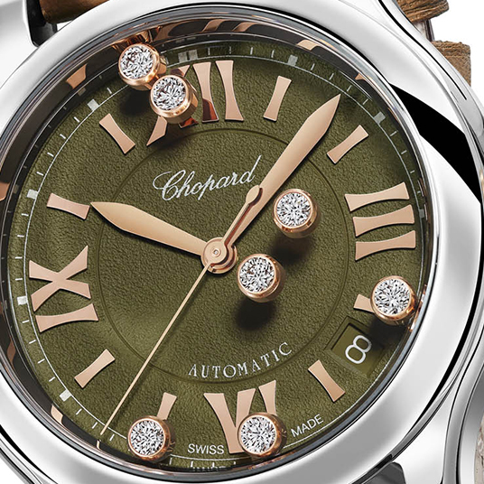仕様:時・分・秒表示、4時と5時の間に日付表示、フロステッドテクスチャーのカーキカラー文字盤、7石のムービングダイヤモンド、グリーントルマリンをセットしたファセットカットの18Kエシカルローズゴールド製リューズ、シースルーケースバック
