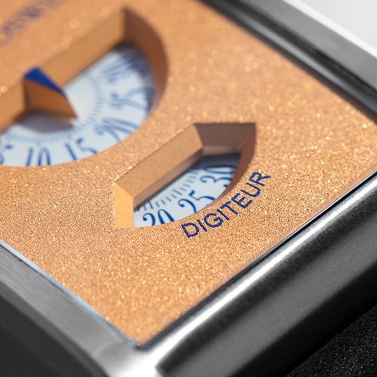 仕様:12時位置にジャンピングアワー表示、中央にデジタル分表示、6時位置にランニングセコンド表示、真鍮製のサンドブラスト仕上げ4Nダイヤル、新しいオニオンクラウンリューズ、サファイアクリスタルケースバック