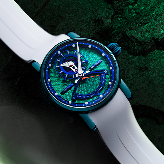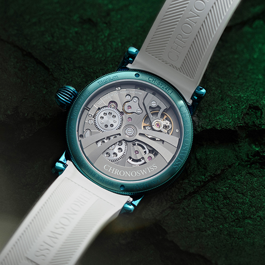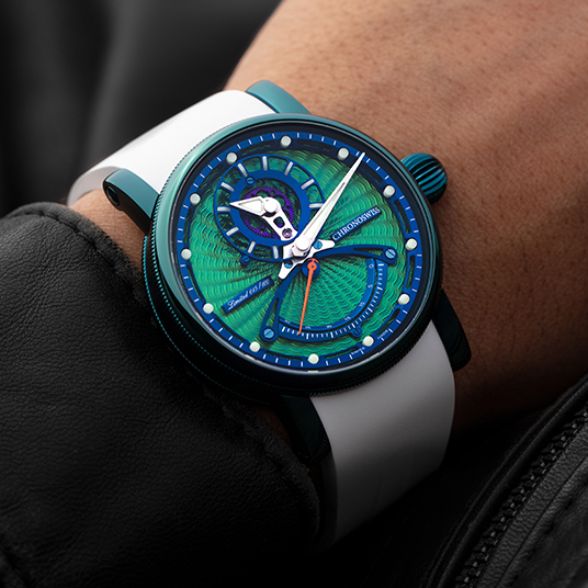 仕様:12時位置に時表示、中央に分表示、6時位置にレトログラード・セコンド、ハンドギョーシェ彫りとグリーンCVDコーティングを施した3次元構造ダイヤル、セラミック製インデックスにスーパールミノバ、サテン仕上げとサファイアクリスタルを備えたねじ込み式ケースバック