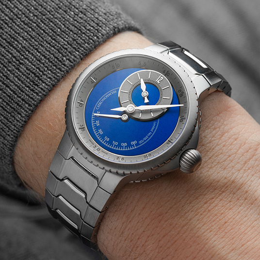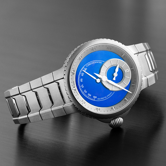 仕様:12時位置にオフセンター時針、中央分針、6時位置にレトログラード秒針、3D構造のCVDコーティングされたブルーダイヤル、ねじ込み式のサテン仕上げサファイアクリスタルケースバック