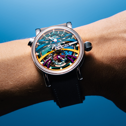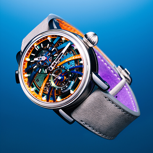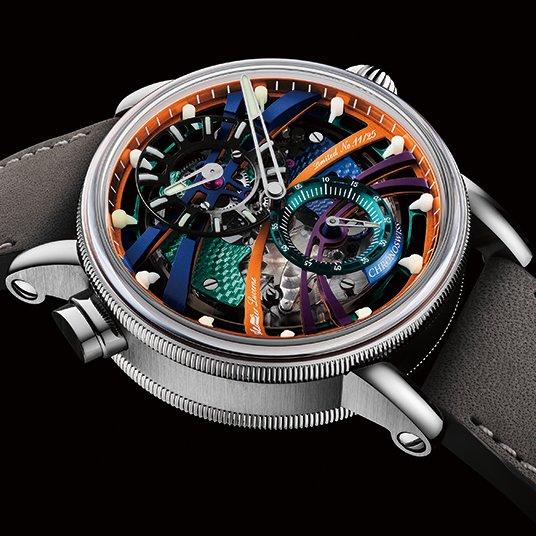 仕様:12時位置にオフセンター時表示、中央分表示、6時位置にスモールセコンド、ハンマーが時間正時と15分単位の時間を音で知らせるクォーターリピーター機能、CVDコーティングされたスケルトン文字盤とブリッジ、ねじ込み式のサテン仕上げサファイアクリスタルケースバック