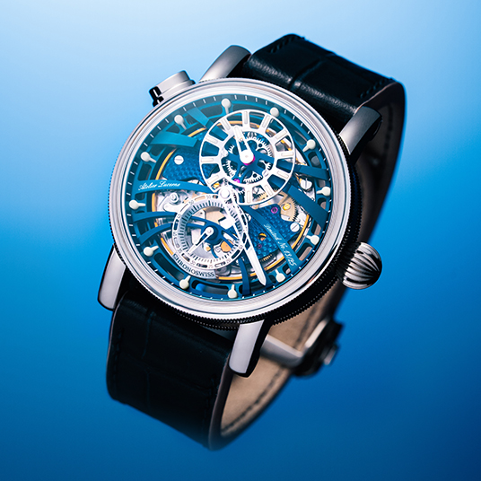 仕様:12時位置にオフセンター時表示、中央分表示、6時位置にスモールセコンド、ハンマーが時間正時と15分単位の時間を音で知らせるクォーターリピーター機能、CVDコーティングされたスケルトン文字盤とブリッジ、ねじ込み式のサテン仕上げサファイアクリスタルケースバック