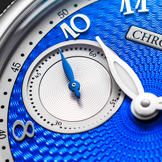 仕様:中央に時針と分針、9時位置にスモールセコンド、手作業によるギョーシェ彫りとアジュラージュ仕上げのCVDコーティングサブダイヤル、ねじ込み式のサテン仕上げサファイアクリスタルケースバック