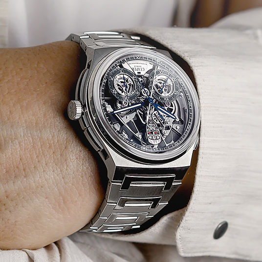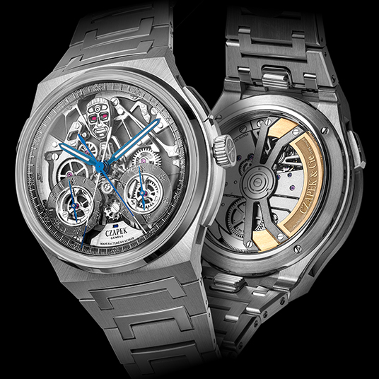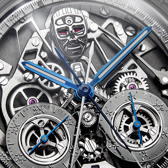 仕様:時・分・秒(スモールセコンド)表示、スプリット・セコンド モノプッシャー・クロノグラフ、ラトラパントON/OFF表示、ロボットの頭部でクロノグラフの作動状態を表示(作動中:イエロー、停止中:レッド、リセット中:ブルー)、オープンワークダイヤル、シースルーケースバック