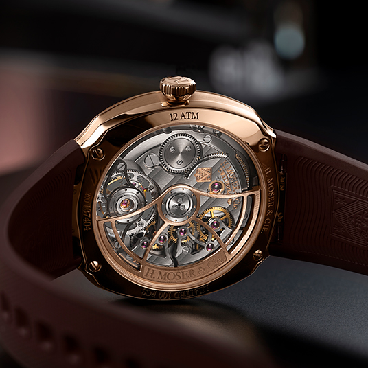 ストラップ:チョコレートカラーの一体型ラバーストラップ、H.モーザーのロゴが刻印された5Nレッドゴールド製ブレード付きフォールディングクラスプ